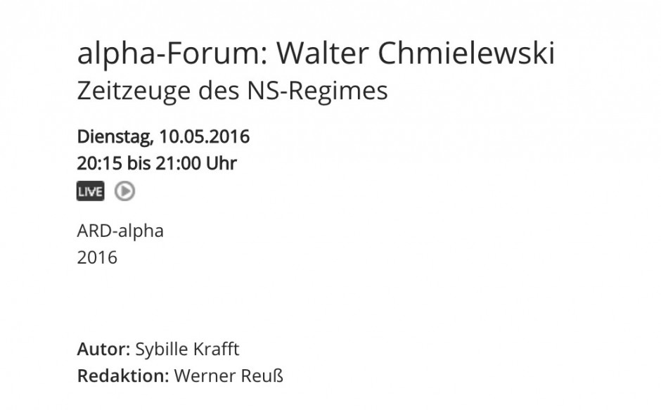 Der Bayerische Rundfunk bringt das 45minütige Gespräch mit Walter Chmielewski, dem Protagonisten des Buches »Der Sohn des Teufels«, am 10. Mai um 20:15 Uhr auf BR alpha, dem ARD Bildungskanal. Walter Chmielewski, heute 87 Jahre alt, ist einer der letzten…