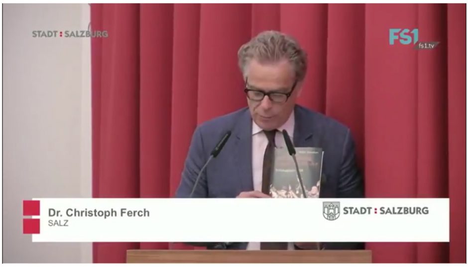 Zum Thema Erinnerungskultur sprach Dr. Christoph Ferch (Fraktion SALZ) am 30. Mai 2018 im Salzburger Gemeinderat. Ein besonderer Anlass war gegeben: der 105. Geburtstag von Marko Feingold. Feingold ist der älteste Holocaust-Überlebende Österreichs und immer noch aktiver Präsident der Israelitischen Kultusgemeinde Salzburg. Ein Mensch, der des Erinnerns nicht müde wird. Die einen nennen es großartig, er nennt es seine Pflicht. Für mich war es eine Ehre, ihm mein Buch – aus den Händen von Christoph Ferch – überreichen zu dürfen. So war mein Geburtstagsgeschenk für Marko Feingold auch ein Geschenk für mich. Ich bedanke mich herzlich dafür.